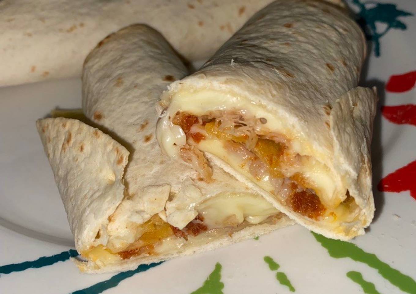 - Ponemos las tortillas de trigo en el microondas unos 10 segundos a potencia media (esto es para poder doblarlas sin partirlas). Sacamos y rápidamente colocamos el queso y la carne. Esto solo en el centro de la tortilla, cuidado, si la cargas mucho se saldrá el relleno o se puede partir la tortilla