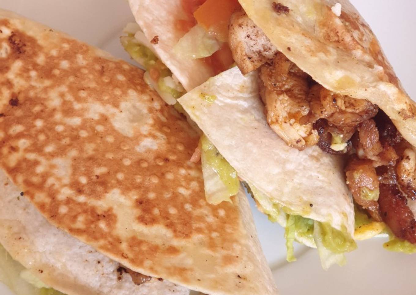 - Cogemos las tortitas de maíz y las dividimos en 4 espacios, haciendo un corte en el medio para poder manejarla mejor. Pondremos el guacamole extendido y el sazonador de guacamole por encima en la mitad de la tortita. Un poco de 4 quesos rallado. Lechuga iceberg, tomate y el pollo.