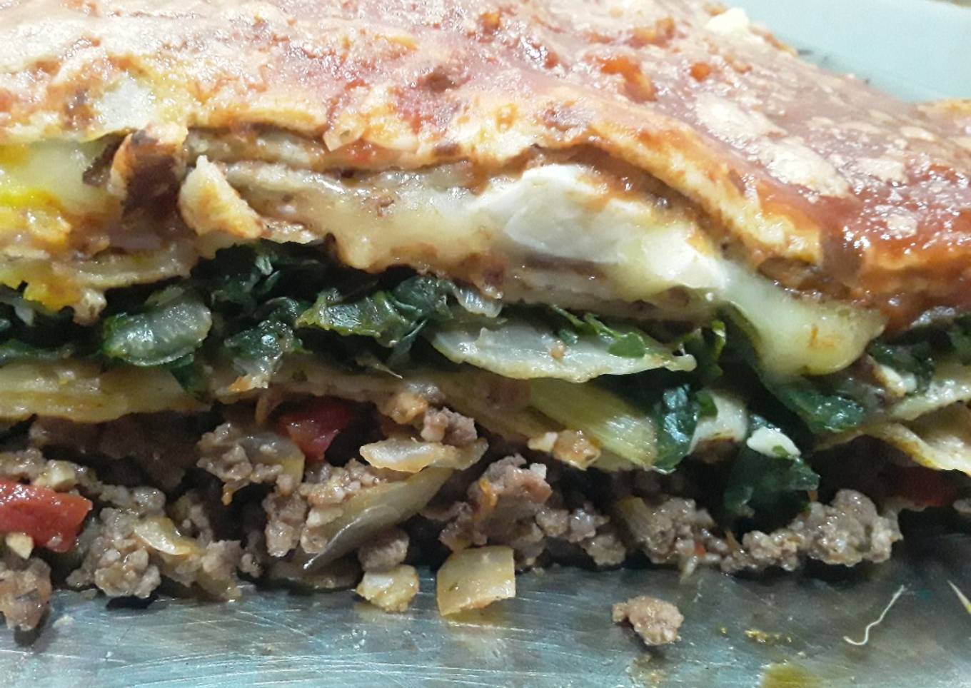 - Para el armado se pone masa en la base, se coloca el relleno 1, volvemos a poner masa, agregamos el relleno 2, otra capa de masa, relleno 3 y por último cerramos con otra capa de masa y encima la salsa.
