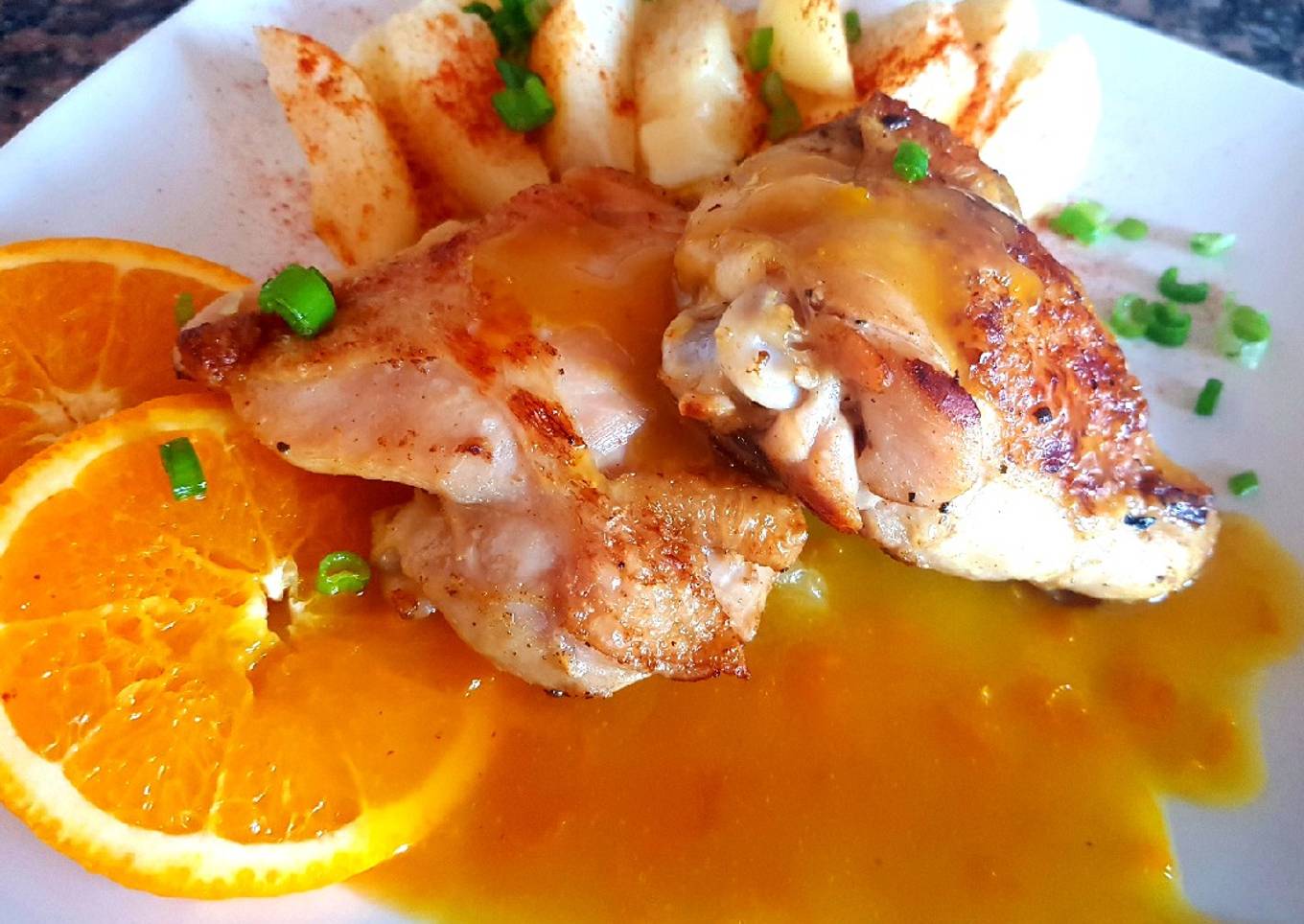 Muslo corto de pollo con salsa de naranja y papas. 🍊