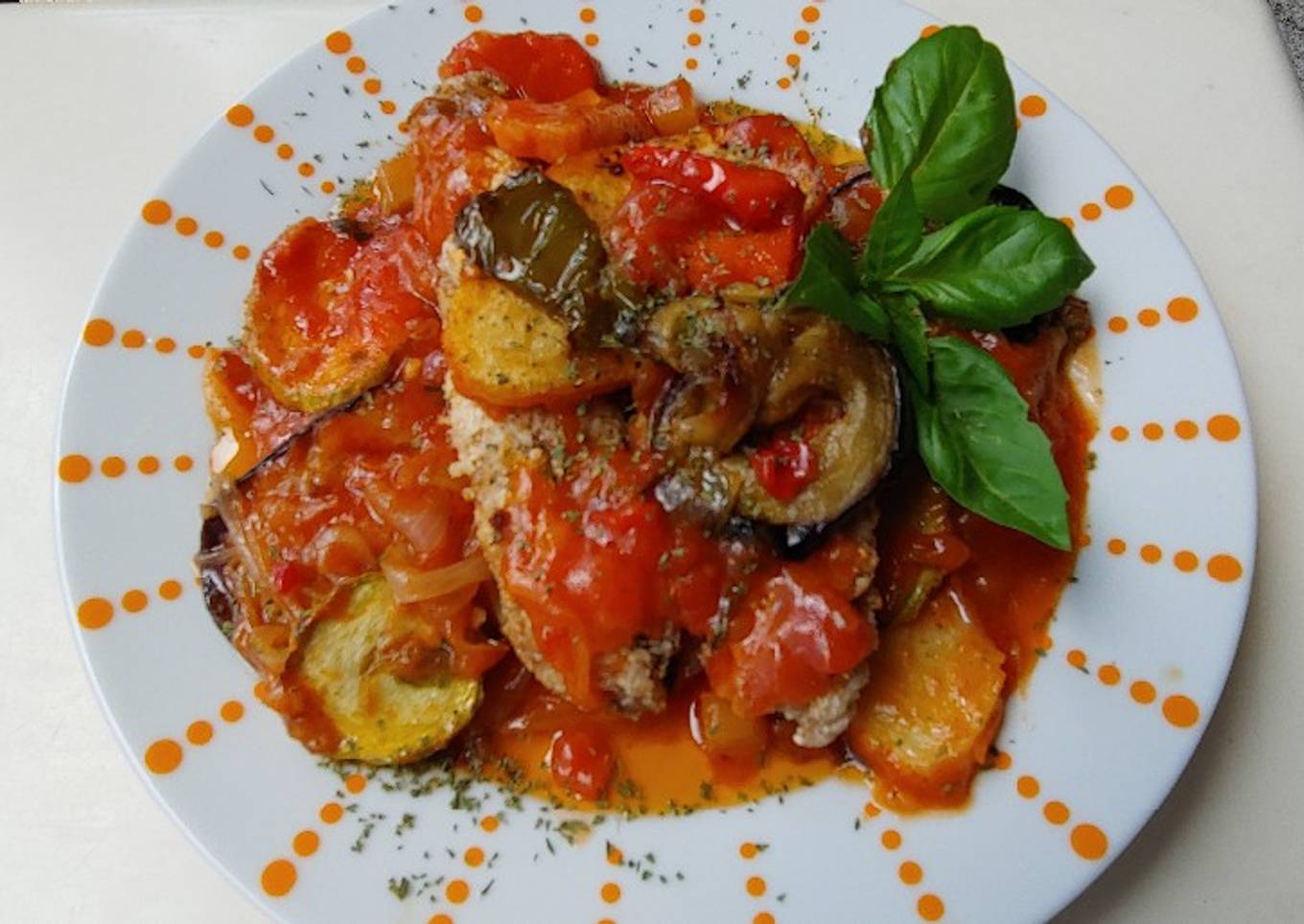 - Haremos capa de tomate, verduras y berenjena. Calabacín, cebolla, etc..