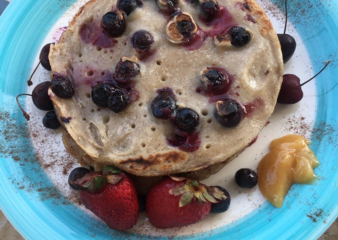 - Colocar en un sartén un poco de aceite y verter un poco de mezcla; cocinar por alrededor de 4 min por lado. Agregar arándanos. Entre panqueques agregar aceite.