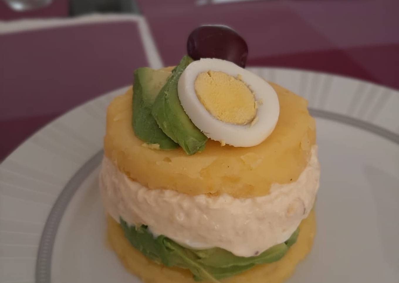 - Sobre un plato colocar un molde individual (previamente le coloqué un poquito de aceite para evitar que se pegue la papa en el molde) colocar un poco de la papa previamente prensada y sazonada, luego una cama de la palta, luego otra de huevos duros y luego el pollo con mayonesa. Cubrir con otra capa de papa.