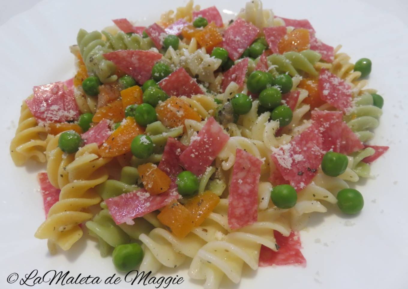 - A la hora de servir, repartiremos la ensalada de pasta y decoraremos con el salami, que teníamos reservado y picado en trozos pequeños y por último, espolvorearemos con queso parmesano.