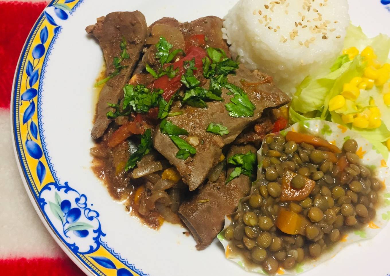Higadito con vegetales y lentejas guisada con Tocino vegetal!