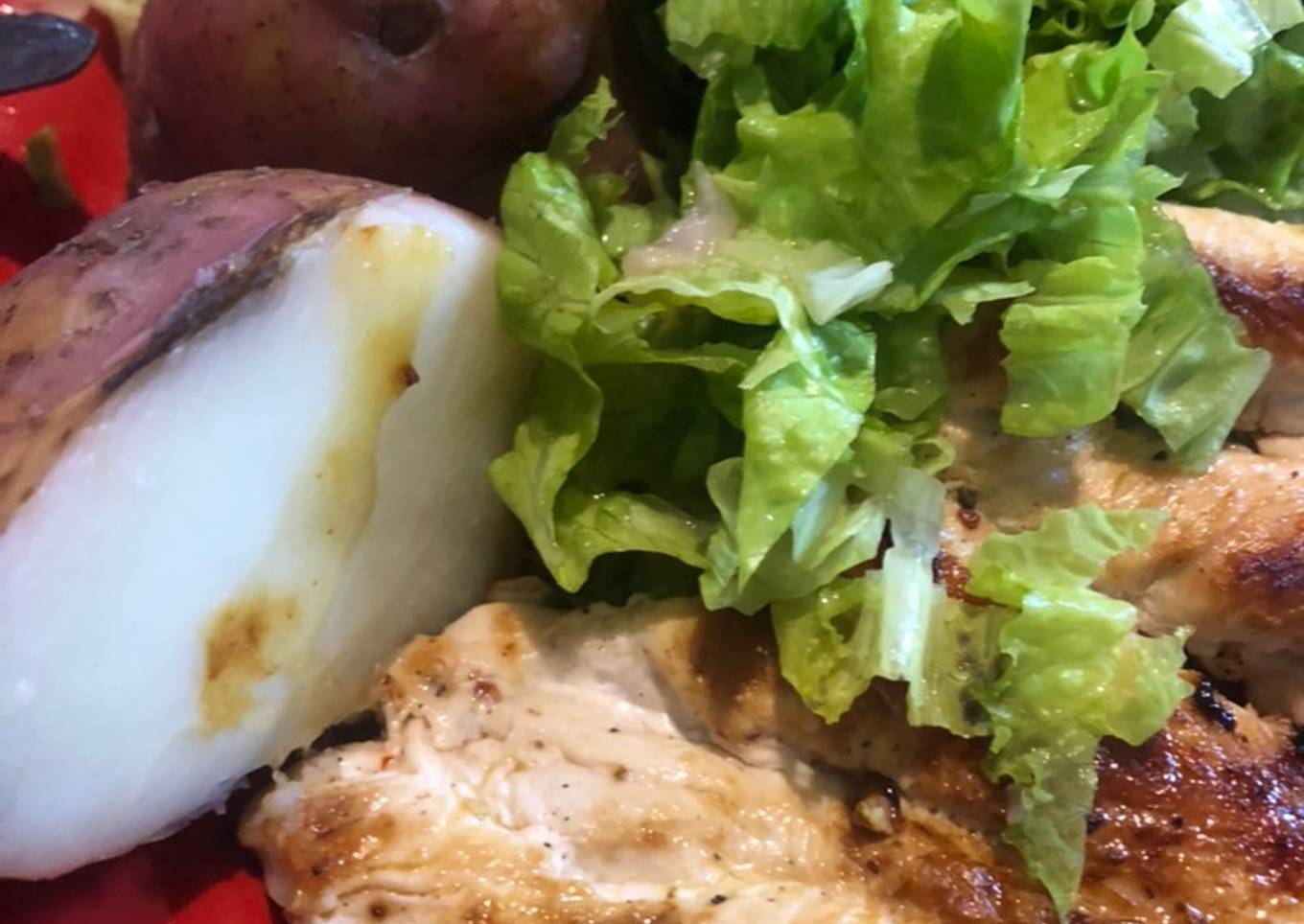 - Servimos la pechuguita con la papa y cortamos bien finito hojas de lechuga que condimentamos con sal limón y unas gotas de aceite de oliva! Listo plato completo verdura carbohidratos y proteína!! Excelente!!