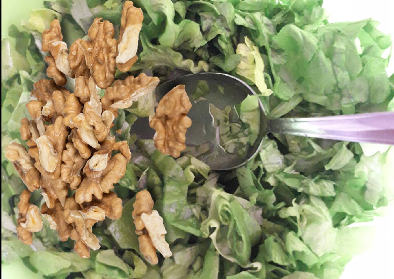 - La lechuga se lava muy bien con abundante agua. Luego se escurre, se corta de forma pequeña y se aliña con aceite de oliva, sal, jugo de limón, ajo picado y nueces. Se revuelve bien y se sirve.